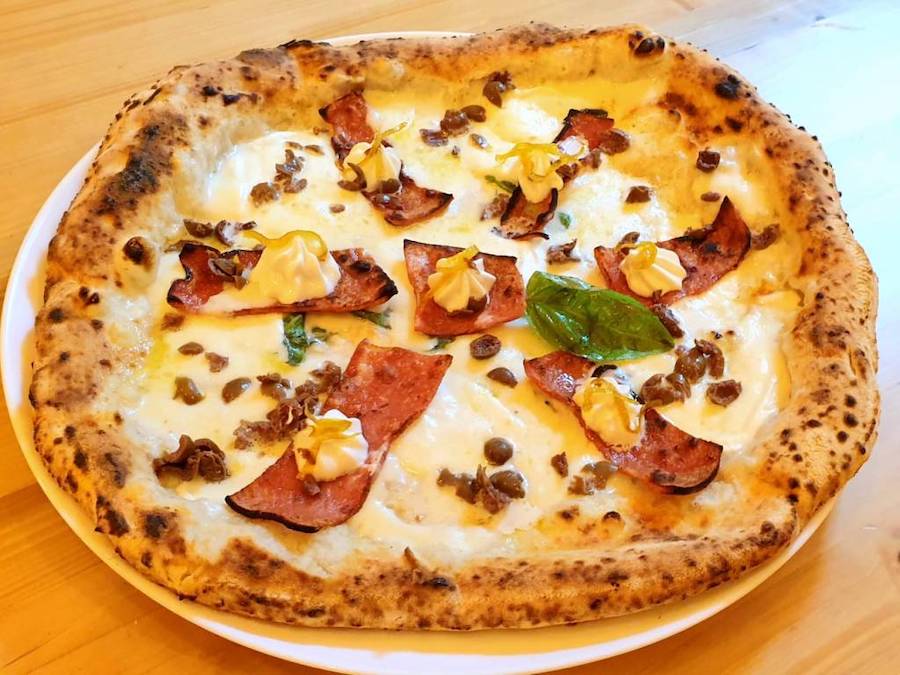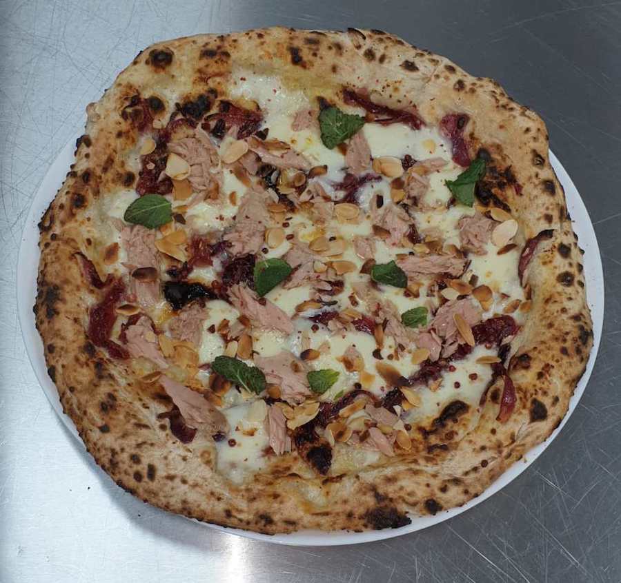“Due creazioni speciali. La prima ‘Central pork‘ con mozzarella di bufala, mortadella piastrata e in uscita ciuffetti di fior di ricotta, olive taggiasche e scorzette di limone candite. E la seconda: El – Tonn – John con cipolla di tropea caramellata all’arancia, fior di latte di agerola e in uscita filetti di tonno, pepe rosa, mandorle tostate e menta.