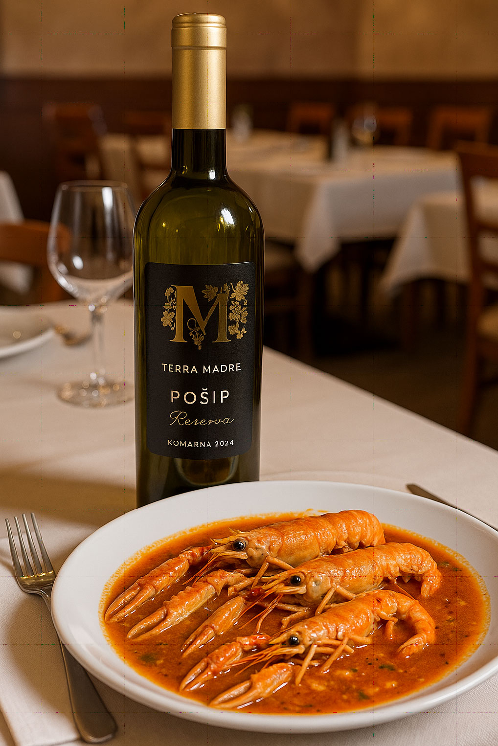 Zara (Zadar) è una città sospesa tra antico e moderno: l’organo marino, i resti romani, la luce del tramonto che colora il lungomare. La nostra cena è stata un piatto di scampi alla buzara, dolci e succosi, accompagnati da un Pošip dell’isola di Korčula: un bianco elegante, con note tropicali e un sorso pieno e fresco. La combinazione era armonica, quasi naturale, come se mare e terra si incontrassero davvero in bocca.