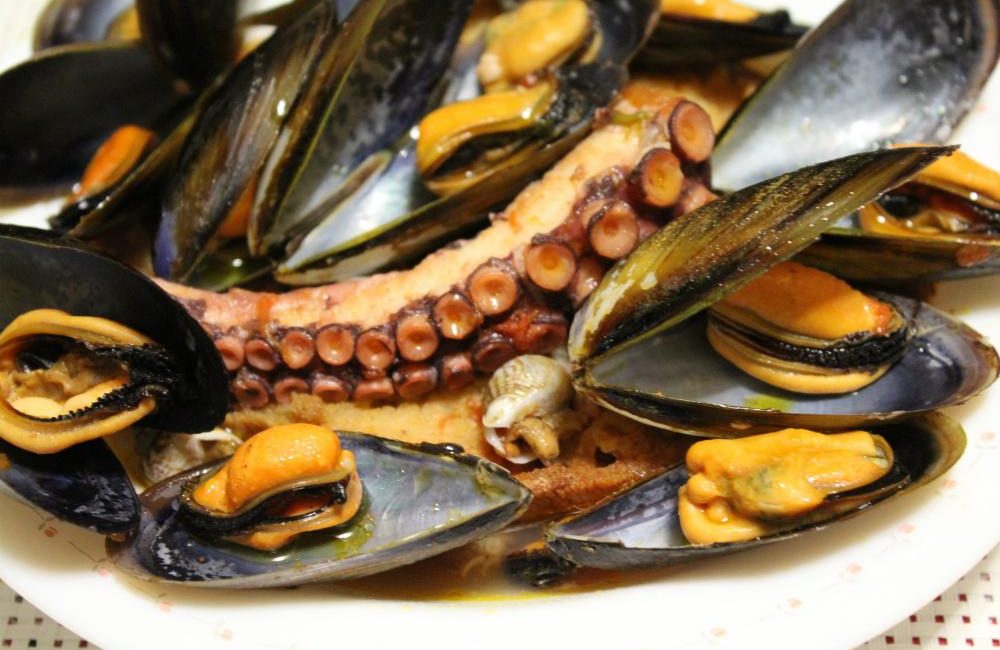 A questo punto aggiungere i tentacoli del polpo, cuocere per altri 6/7 minuti a pentola coperta dopo aver aggiunto 3 mestoli di brodo caldo di polpo. Ogni tanto controllare e girare delicatamente con un cucchiaio di legno. Nel frattempo in una pentola soffriggete l’aglio e l’olio, mettete le cozze e fatele cuocere aggiungendo qualche mestolo di brodo caldo di polpo fino a quando non saranno aperte. Stessa operazione per le vongole e i lupini da cuocere separatamente. In un’altra padella scottate i gamberi.