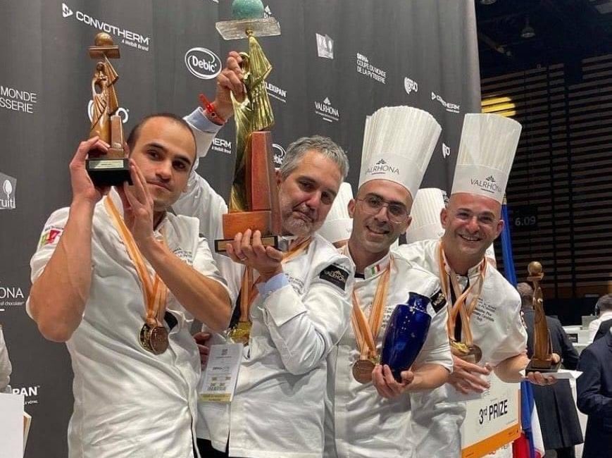 Italia campione del mondo di pasticceriaL’Italia della pasticceria ha vinto la Coppa del Mondo. Per la terza volta nella storia della competizione mondiale gli Azzurri salgono nuovamente sul podio. Una grande enorme, l’arena del Sirah di Lione è in visibilio e si canta l’inno di Mameli. Una vittoria grazie al team composto da Lorenzo Puca, Massimo Pica e Andrea Restuccia, che si va ad aggiungere ad un 2021 fantastico per il nostro Paese: dopo le nazionali maschili e femminili di pallavolo che vincono gli Europei, la Nazionale azzurra di calcio che porta a casa gli altri Europei, Berrettini che gioca in finale a Wimbledon e i Maneskin sul podio dell’Eurovision e le Imprese azzurre alle Olimpiadi. Una vittoria meritata che vede l’Italia al Primo posto, secondo il Giappone, terza la Francia; premio alla sostenibilità alla Svizzera, premio allo spirito di squadra al Cile.